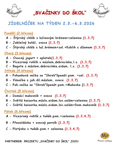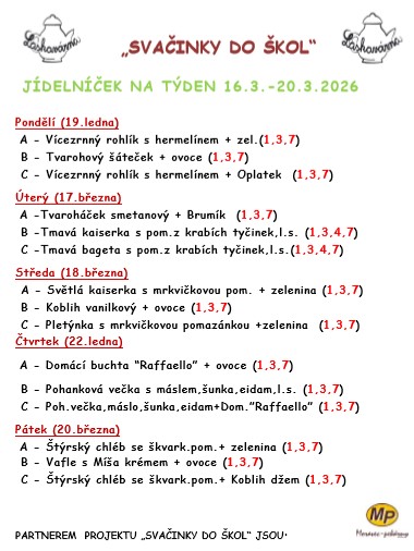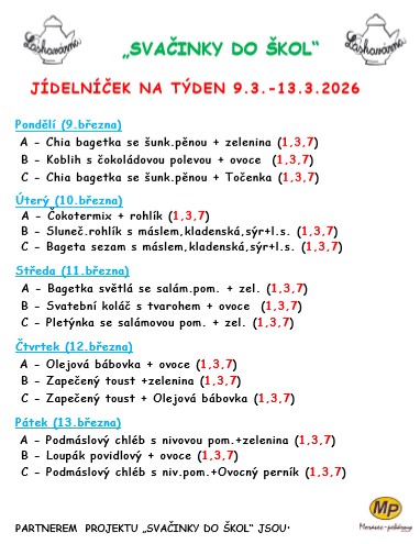 Odhlásit svačinky z důvodu nepřítomnosti (nemoc, karanténa,...) v průběhu týdne je možné na tel.: 733 741 415 kavárna, nebo 739 049 496 p.Teplá,