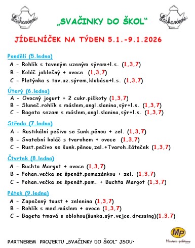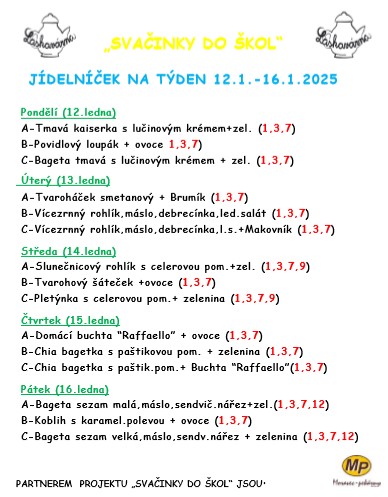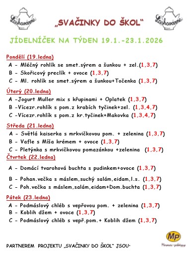 Odhlásit svačinky z důvodu nepřítomnosti (nemoc, karanténa,...) v průběhu týdne je možné na tel.: 733 741 415 kavárna, nebo 739 049 496 p.Teplá,